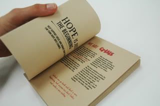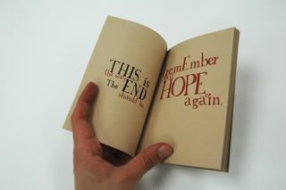 The book explores a short story of the collapse of a homeless person, from the moment he or she loses their home to the point where their mind has made them believe there is no hope for them and deemed them mentally and emotionally unstable. The book mechanics then revert, subtly introducing the turning point where Crisis enters their life and “turns it around”. The book is then read backwards from right to left appearing to go back to the beginning when infact the beginning is now the end, the “start ending of a new ending” as the quote I found suggests. I thought “Hope” was an appropriate title for the book but with “less” written behind it. Hope stands forward of it, indicating that nothing is hopeless, and that hope can be brought out of something that is considered hope-less. All materials used were 100% recycled or salvaged to further stress the idea of making use out of something useless.